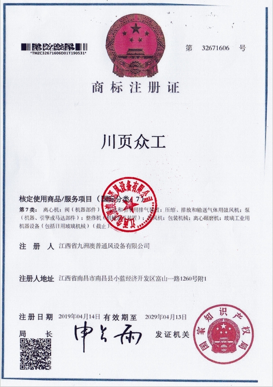 • 商標注冊證(川頁眾工
